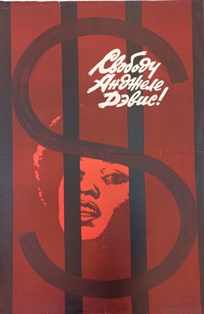 Плакат Каждана ставит на первый план советский антиамериканизм. Тюремная решетка в виде знака доллара отсылает к глобальному капитализму и угнетению, но можно сказать, что решетка это такая же ее — Анджелы, как и наша. Советский диссиденты*ки уже тогда пытались противопоставить свое угнетение советской системой борьбе за гражданский права в США (см. речь Александра Солженицына в Нью-Йорке, 1975). Что шло тогда в разрез стремлению активистов*к видеть несправедливость повсюду, как в США так и в СССР, сегодня имеет шанс найти общие точки соприкосновения.