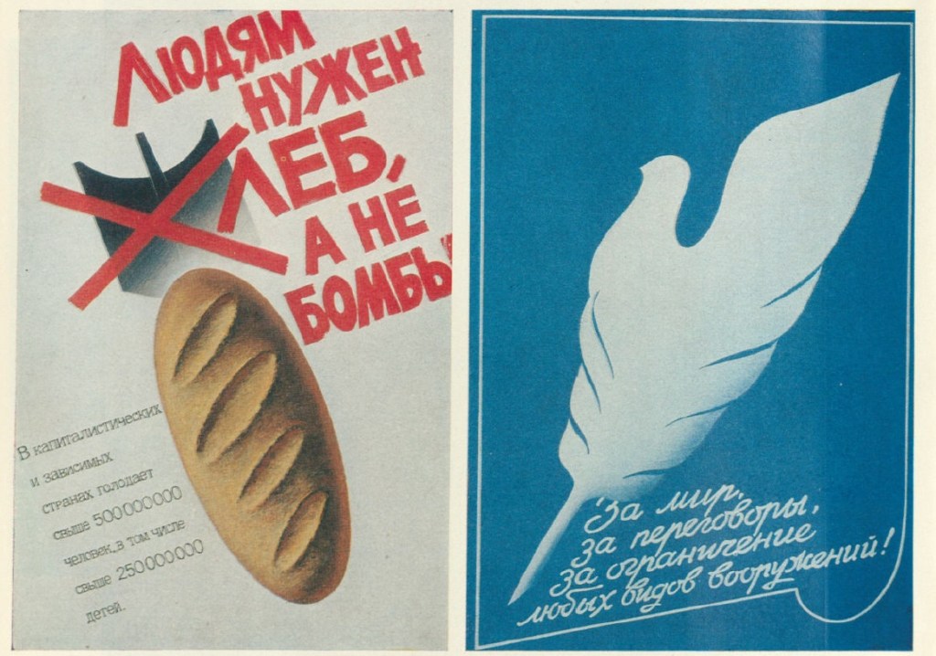 Плакатные слоганы «За мир, за переговоры, за ограничения любых видов вооружений!» или «Людям нужен хлеб, а не бомбы» вполне себе соответствуют сегодняшней злобе дня, как бы не казалось, что советский интернационализм и постсоветская антивоенная оппозиция путинскому режиму стоят далеко друг от друга.