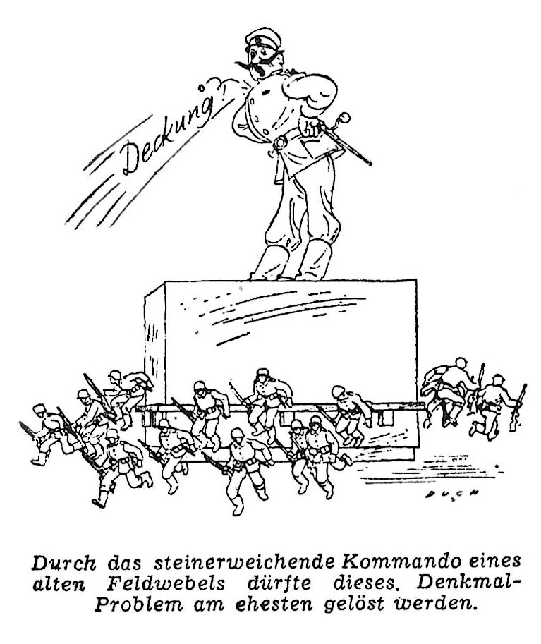 Начиная с массовых протестов против установки ядерных ракет в Западной Европе в 1981 году «кригсклотц» становится целью для акций прямого действия. Облитый красной краской он снова привлекает к себя внимание прохожих и общественности. В этом же году резервисты вывешивают на нем баннер «героическая смерть без нас».6 В 1982 году Гамбургское бюро по вопросам культуры организует конкурс на лучшую идею на переделку памятника, чтобы «сломить его прославляющее войну влияние». Вопреки результатам конкурса в 1985–86 году появляется контр-памятник Альфреды Хрдлички, что на следующие несколько лет снимает некоторую часть общественного напряжение вокруг памятника до того момента, как началась кампания за памятник дезертиру.