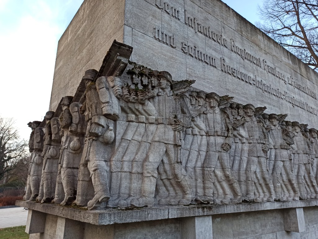Тем не менее мемориальные плиты не единственная связь памятника со Второй мировой и вермахтом. В 1979 году коллектив студентов- и студенток-искусствоведов университета Гамбурга выпустил небольшое исследование под названием «Один военный памятник в Гамбурге», в котором они внимательно изучили историю его создания. В подразделе «1933–1936. Конкурс и исполнение» коллектив авторов*к разбирает историю конкурса на памятник и показывает, что, готовясь ко второму туру, Куёль делает значительные изменения в эскизе памятника, отходя от первоначального замысла. Он добавляет на памятник слоган «Пускай мы погибнем…», при этом уменьшая значение герба города в общей композиции. Пафос чествования павших солдат вовсе исчезает. Куёль отказывается от символической могилы рядом с памятником в пользу каменной плиты с девизом «Большие дела прошлого являются опорами моста в будущее» и перечислением битв, в которых принимал участие 76 полк. Таким образом общее послание памятника смещается от идеи памяти о погибших к идее, пропагандирующей безусловную готовность немецких, гамбургских солдат отдать свою жизнь за родину.4