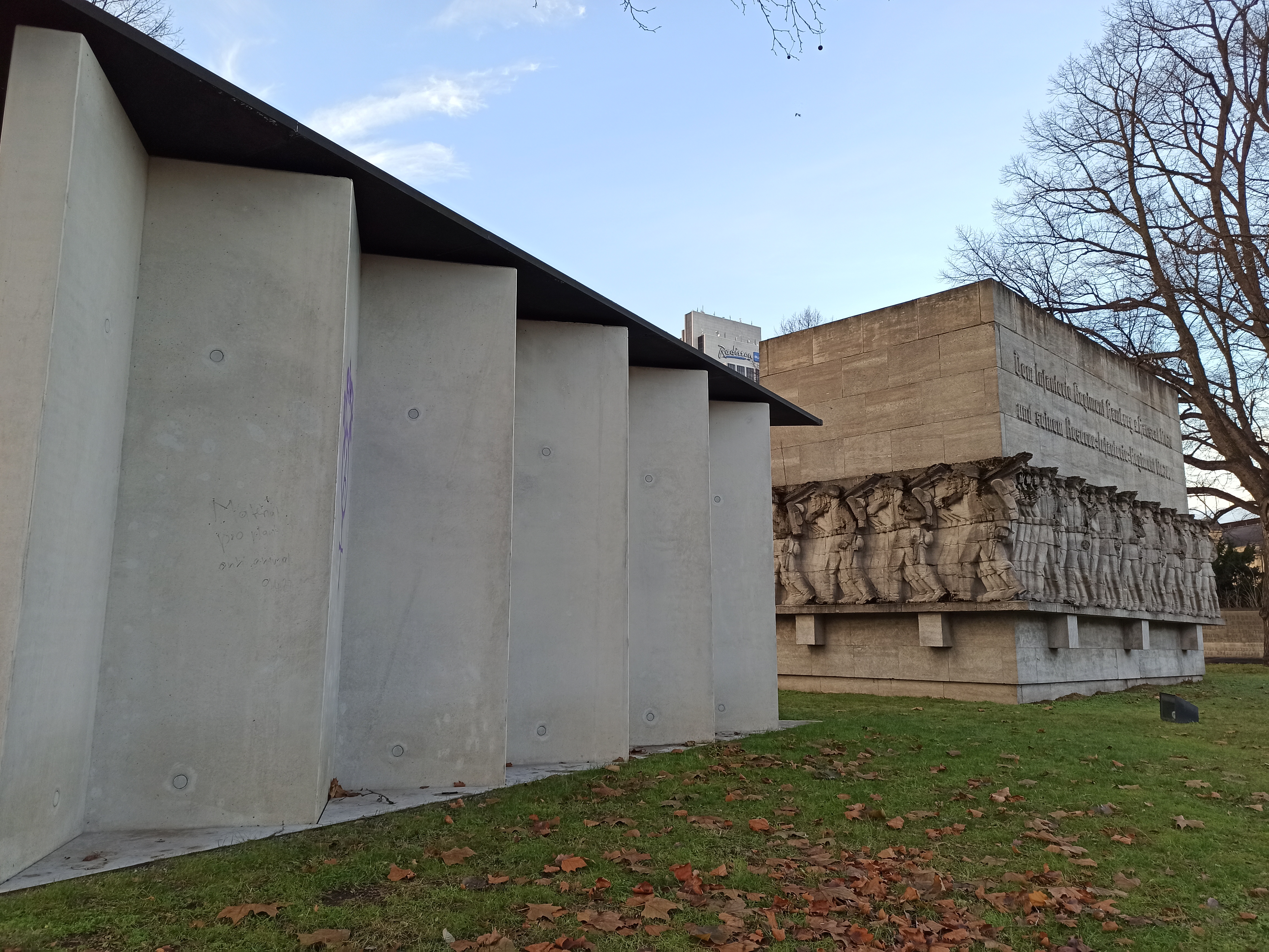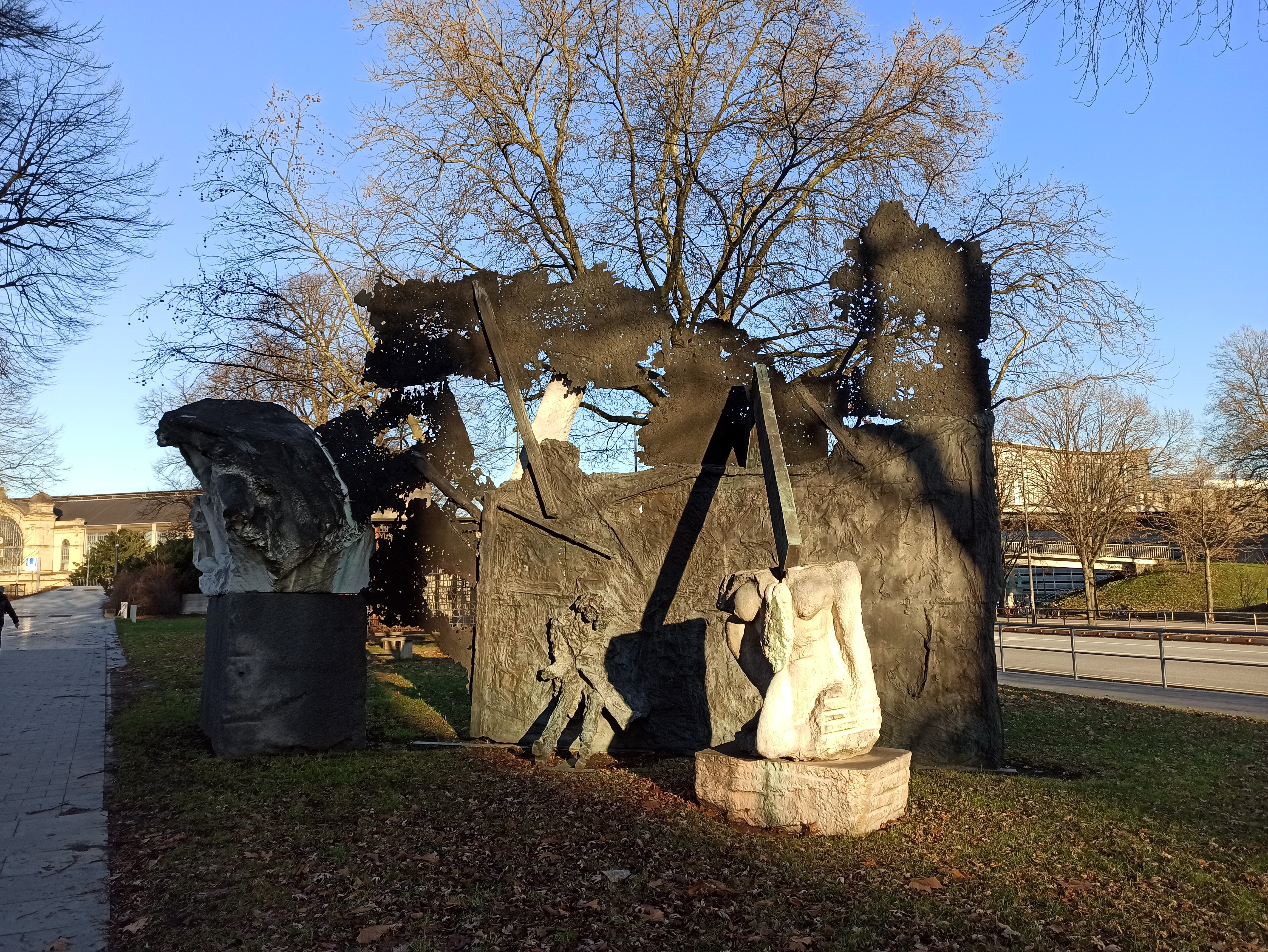 Наличие в одном месте сразу трех памятников создает сложные взаимоотношения между ними, тем не менее в этом тексте я попытаюсь раскрыть взаимосвязь прежде всего между памятником 76-му полку, в народе прозванным «кригсклотц» (Kriegsklotz — военная колода), и памятником дезертиру. Контр-памятник Хрдлички останется за скобками, хотя он безусловно играет важную роль в истории этого места и в дебатах о коммеморации жертв фашистской диктатуры в локальном гамбургском контексте.