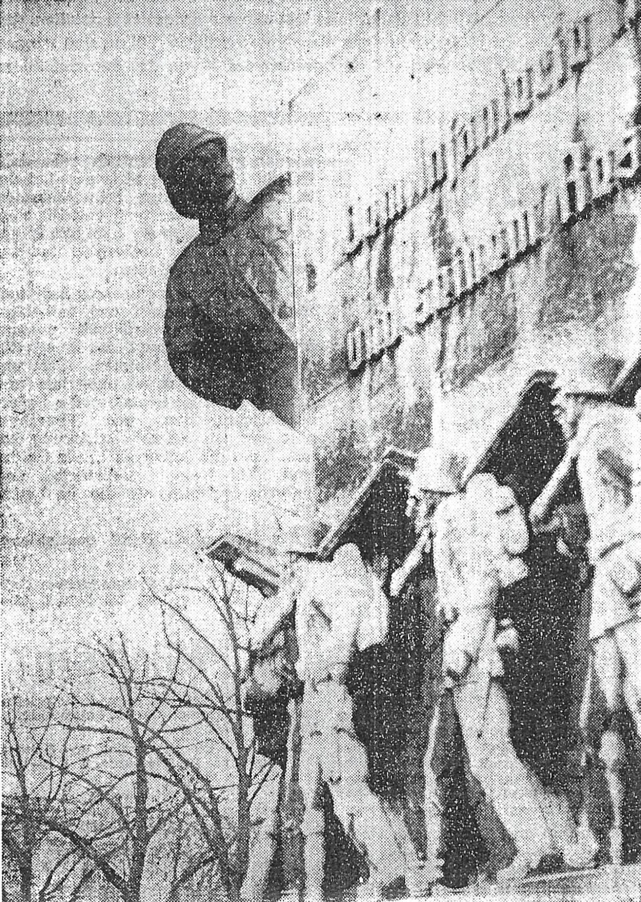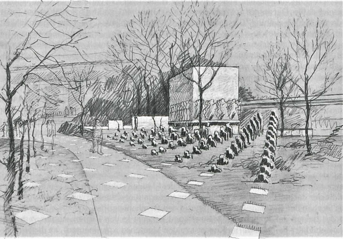Только при более длительном раздумье и рассматривании, можно понять, что стратегия Ланге – это конфронтировать «кригсклотц» на эстетическом уровне, не пытаясь каким-либо образом физически изменить ауру памятника 76-му. Первым бросается в глаза, что лёгкость строения памятника дезертиру противостоит громоздкости и монолитности «колоды». Форма треугольника тоже неспроста, если знать, что плакат Эль Лисицкого «Клином красным бей белых» (1920) одно из самых известных произведений советского авангарда на Западе. Таким образом расположение двух памятников не напрямую повторяет геометрическую композицию плаката, но скорее берет за основу формальный принцип — острое колет монолитное. В соотношении двух памятников треугольник дезертира против прямоугольного монолита марширующих солдат. Еще одна деталь – это ритмические переклички. Марширующие солдаты «кригсклотца» представляют собой метрический орнамент, который отсылает к еще античным фризам. Зигзаг стены памятника дезертиру, если смотреть на него фронтально тоже представляет из себя элементарный геометрический орнамент благодаря игре светотени. Такая перекличка вызывает своеобразную горькую усмешку, особенно если учесть, что победившее, но нереализованное предложение для контр-памятника в 80-е (см. эскиз Ульриха Бёме и Вульфа Шнайдера, 1982) была идея расположить вокруг «кригсклотца» расходящиеся веером от памятника фигуры-солдат, которые постепенно врастали в землю и становились каменными плитами — солдатскими могилами.10 Противопоставление марширующего солдата и гладкой бетонной плиты, несёт в себе сатирическую отсылку к безымянной и бессмысленной смерти солдата.