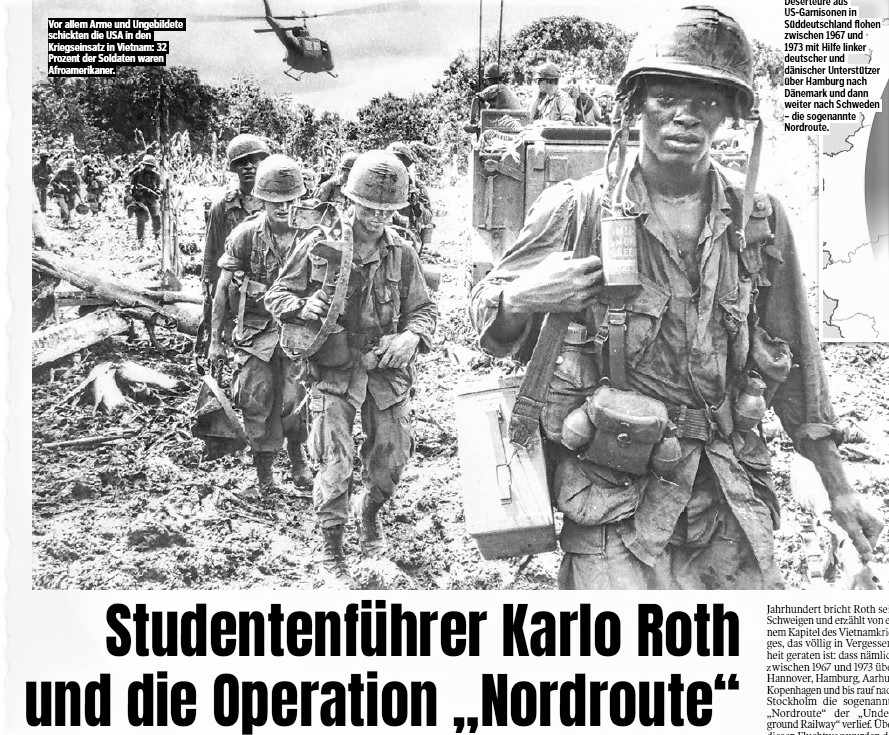 Возвращаясь назад в Гамбург, можно привести пример, когда через своеобразное журналистское возвращение истории, появляется и надежда для сознательных дезертиров в целом. Совсем недавно в гамбургская локальная газета «Мопо» (Hamburger Morgenpost) вышла статья об активисте поколения 68 года Карло Роте (одного из предводителей студенческой группы SDS – Sozialistischer Deutscher Studentenbund) под названием «Как один гамбуржец во время войны во Вьетнаме переправлял солдат США».13 В статье рассказывается о некогда существовавшей подпольной деятельности левых западногерманских активистов*ток, которые переправляли афроамериканских дезертиров времен войны во Вьетнаме по «северному пути», который проходил через Гамбург в Швецию, которая их не выдавала.