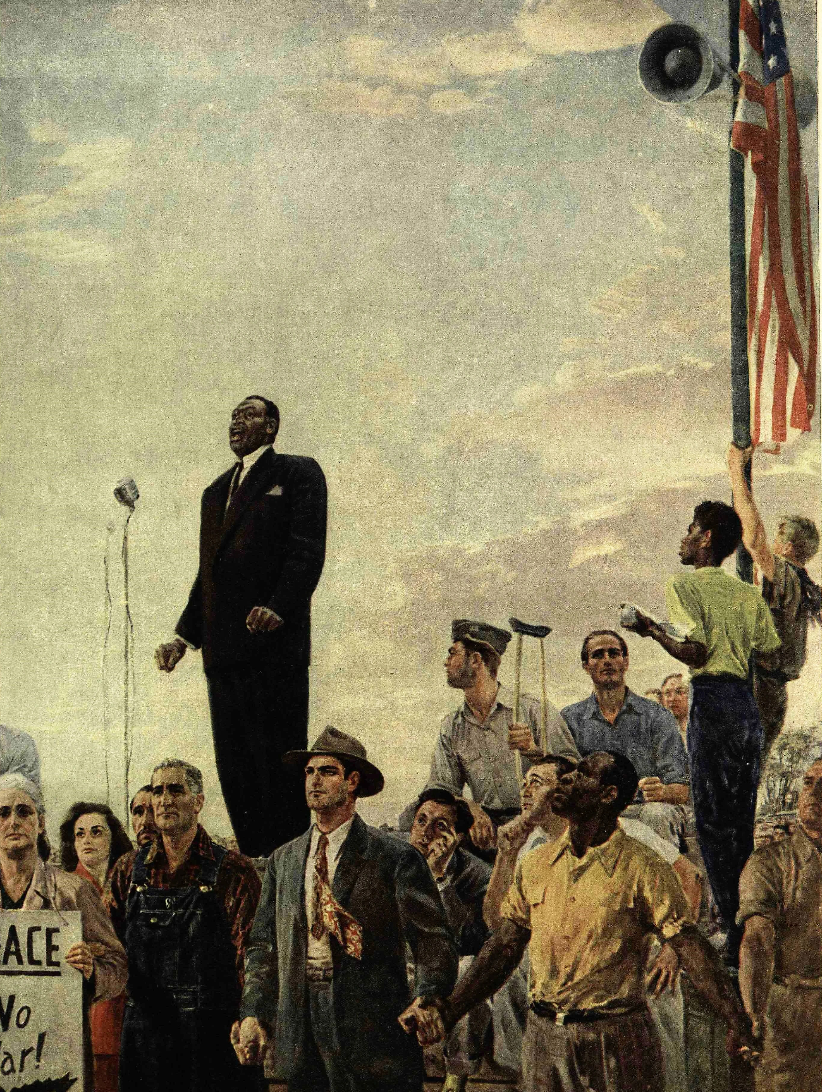 На переднем плане картины изображены люди, представляющие левых профсоюзных активистов, которые держат друг друга за руки, изображая человеческую цепь вокруг сцены. Женщина слева держит плакат с надписью «Мир/ Нет войне!/ Запретить атомную бомбу». За спиной у Робсона простирается голубое небо. Из чего можно сделать вывод, что художники отошли от документального характера картины и не стали рисовать дерево, чтобы создать выразительный символ американского протестного движения. Вместо дерева они изобразили чистое небо с низким горизонтом. «Мирное небо над головой» стало распространенным выражением в советское время, ассоциированное с антивоенным движением. Таким образом, образ Робсона, который поет под мирным американским небом, конструировался художниками, как олицетворение общественной борьбы в США и примером для подражания. Белый и Черный подросток в правой части картины, которые взобрались на флагшток с национальным флагом Соединенных Штатов, являются как бы тому подтверждением.