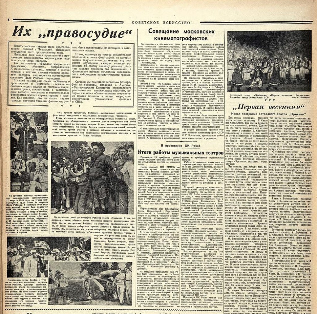 В апрельском выпуске журнала «Огонек» 1951 года, в том самом, в котором напечатана репродукция картины «Песнь мира» с изображением Поля Робсона, на одной из страниц есть рубрика «Наши друзья», где также упоминается его имя. Этот раздел посвящен дружбе советских культурных деятелей с деятелями из других стран. В статье они представлены в парах: композиторы Дмитрий Кабалевский — Вацлав Добиаш (Чехословакия), режиссеры Сергей Юткевич — Луи Дакен (Франция) и художники Дементий Шмаринов — Ренато Гуттузо (Италия). Певец Поль Робсон находится в паре с Иваном Козловским (1900–1993) – одним из самых популярных украинских теноров в СССР того времени. Короткие тексты каждого культурного деятеля посвящены в основном воспоминаниям о войне и размышлениям о мире – и это, безусловно неспроста. В 1951 году Корейская война была в самом разгаре. СССР, наряду с Китаем, активно в ней участвовал, поставляя оружие и направлял военных специалистов. В начале того же номера «Огонька» напечатана и статья писателя Бориса Полевого (1908–1981) под названием «Великая битва», которая имеет откровенно пропагандистский характер. Сталин описывается как «знаменосец мира», а западные державы обвиняются в подготовке новой мировой войны. Статья заканчивается сообщением о всемирной поддержке рабочим классом движения за мир и, в частности, подписания «мирного пакта» между пятью великими державами.