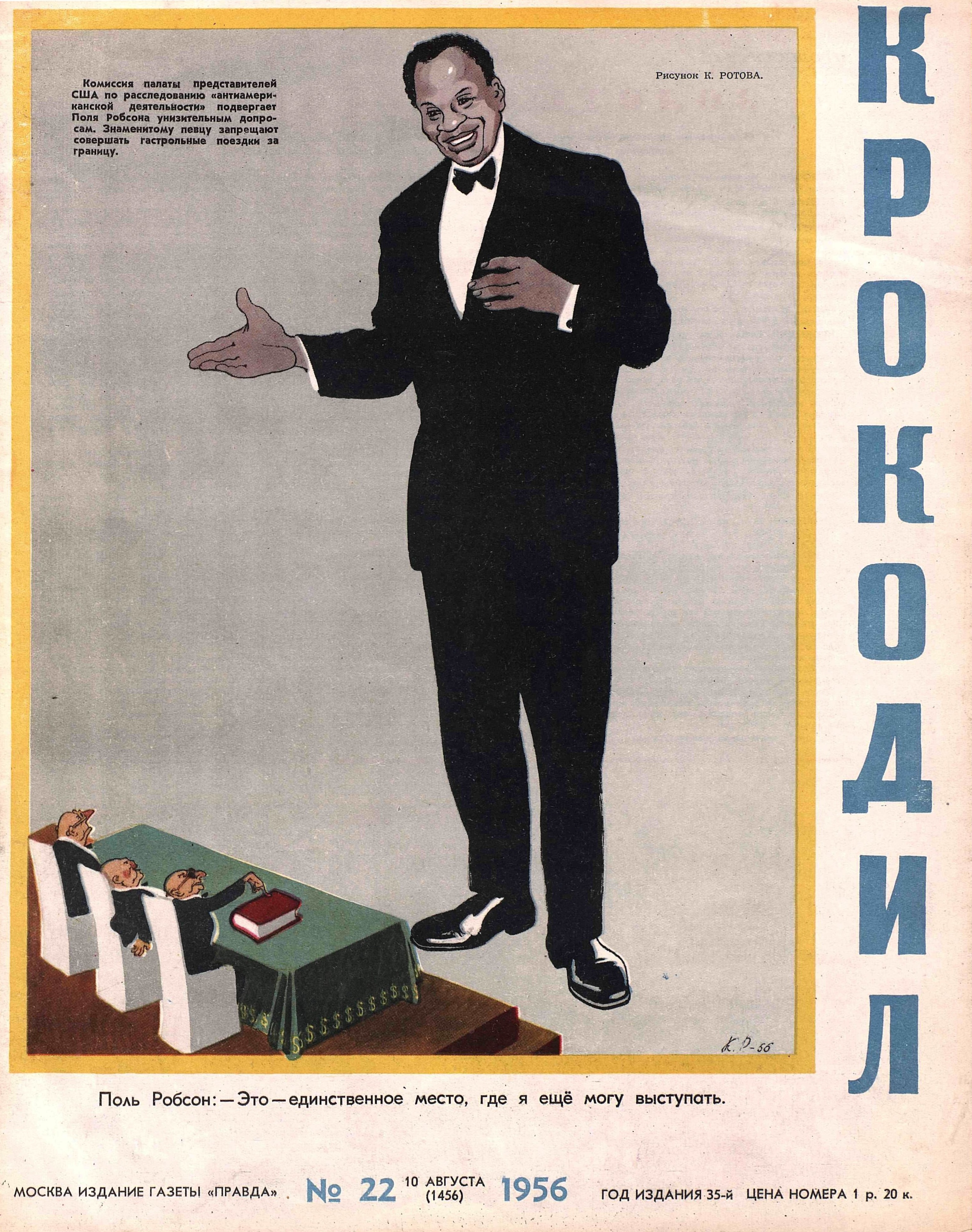 В этой небольшой заметке я расскажу об изображении Поля Робсона (1898–1976), которое массово распространялось в 50-х годах через публикации в крупно-тиражных журналах и на открытках. Речь пойдет о картине «Песнь мира. (Выступление Поля Робсона в Пикскилл, США)», созданной художниками Валентином Поляковым (1915–1977), Игорем Радоманом (1921–1992) и Хаитом Шацом (1915–1990). Картина экспонировалась на Всесоюзной выставке 1950 года в Москве. Цветная репродукция картины была напечатана в журнале «Огонек» (тираж 426 000 экземпляров), а черно-белая в журнале «Смена» (тираж 120 000 экземпляров).