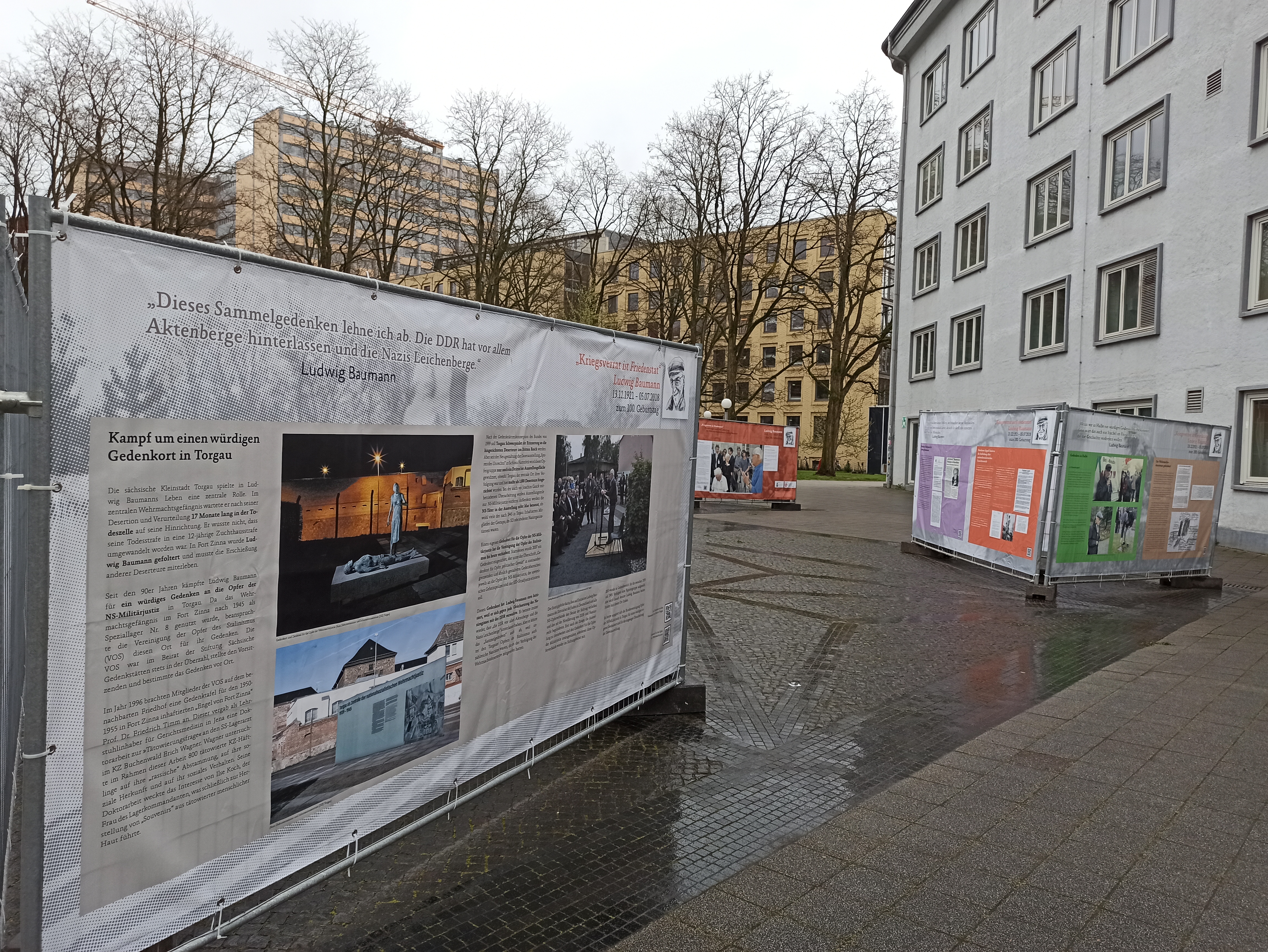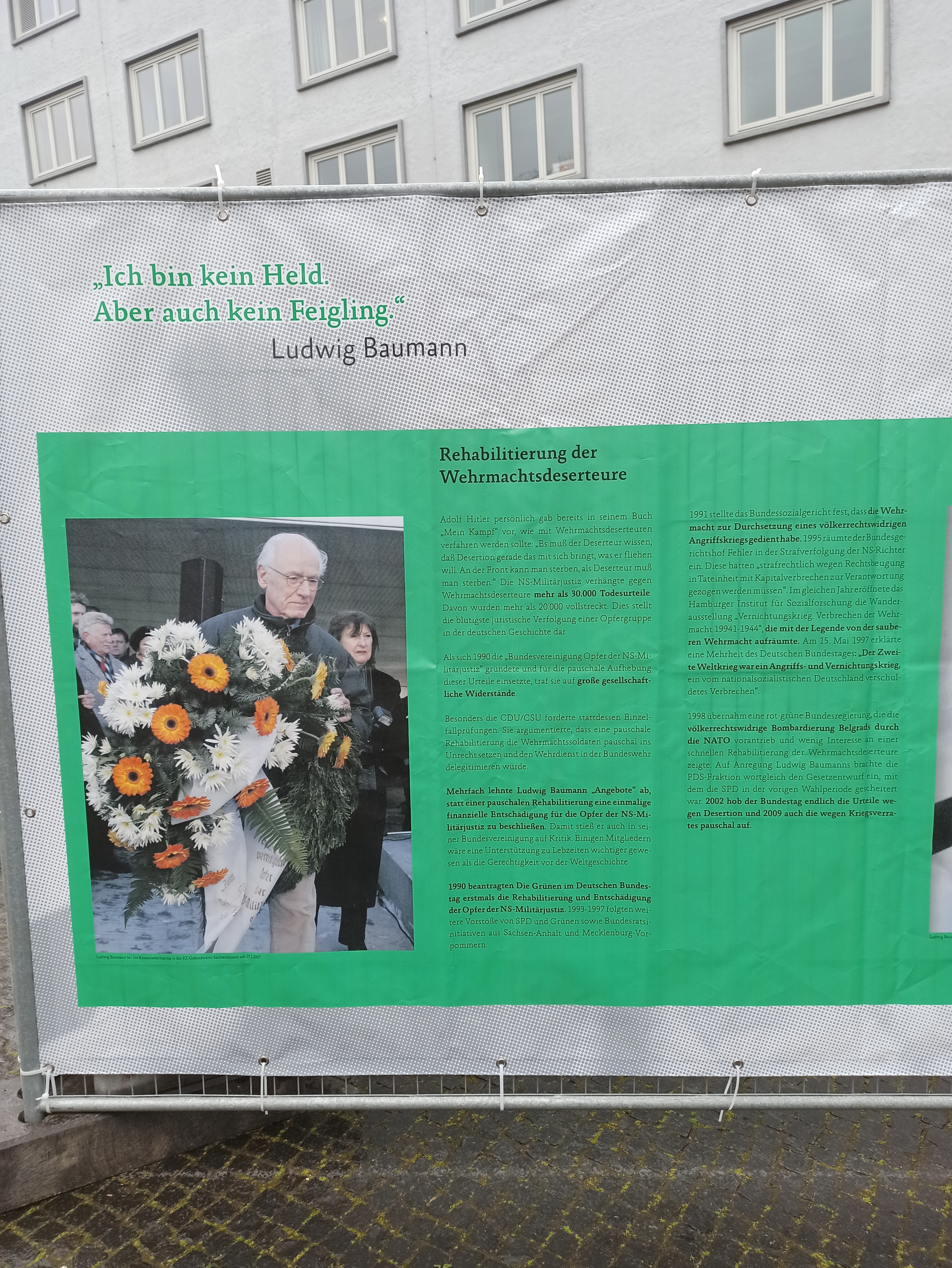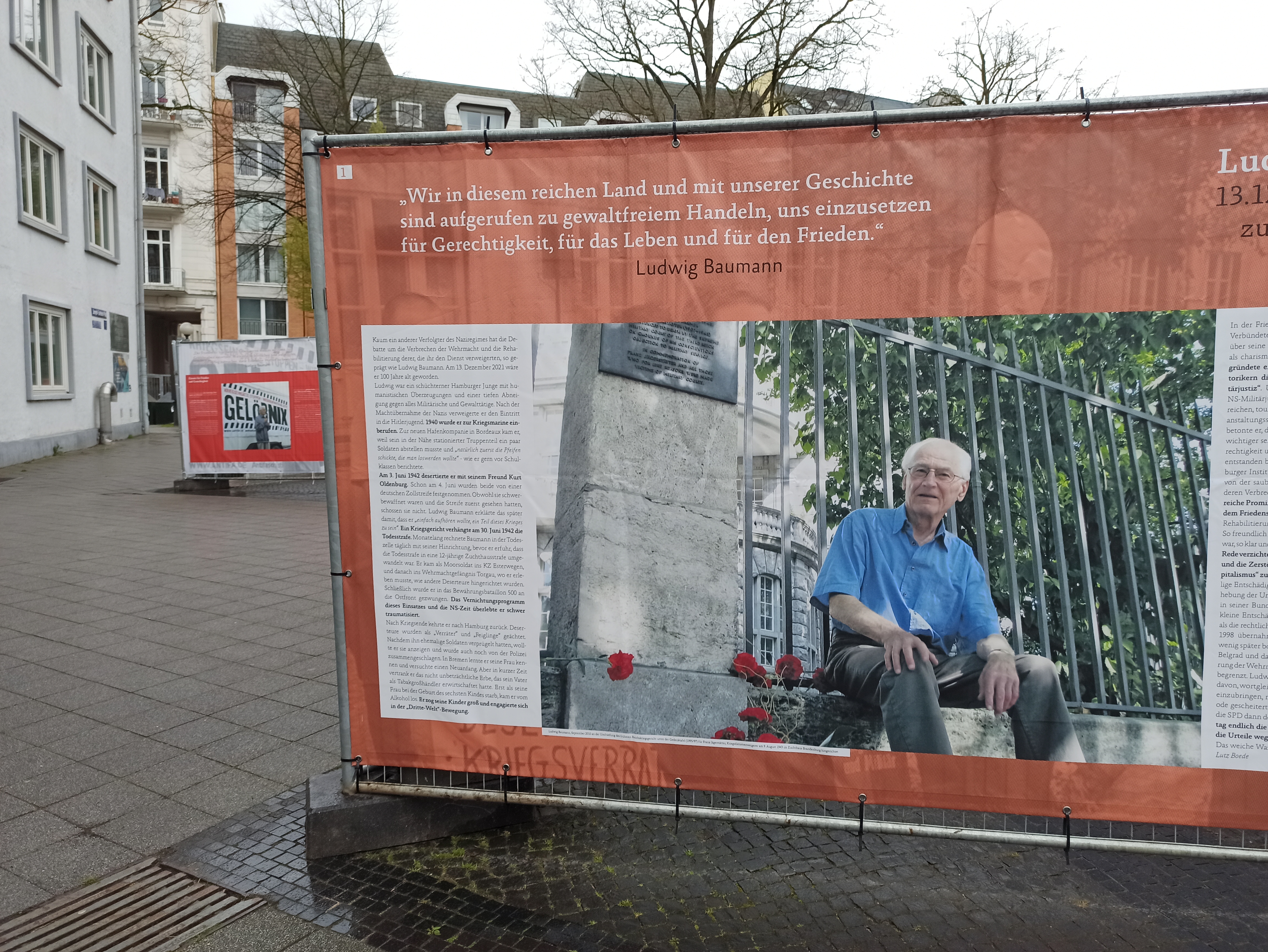 19 апреля в Гамбурге на площади Йосеф Карлебах Платц открылась уличная выставка, посвященная дезертиру Вермахта Людвигу Бауману. Место выбрано неспроста, оно имеет большую символическую ценность в городе. На этой площади рядом с университетским кампусом до 1938 года действовала Синагога на Борнплатц, которую снесли во времена национал-социализма. Площадь названа в честь главного раввина Гамбурга и Альтоны Др. Йосефа Карлебаха (1983–1942), убитого в рижском гетто. Сегодня на площади находится скульптура «Памятник синагоге» (1988) немецкой художницы Маргит Каль (1942–). Скульптура, сделанная в традициях концептуального искусства, представляет из себя мозаику, выложенную черным камнем на земле.