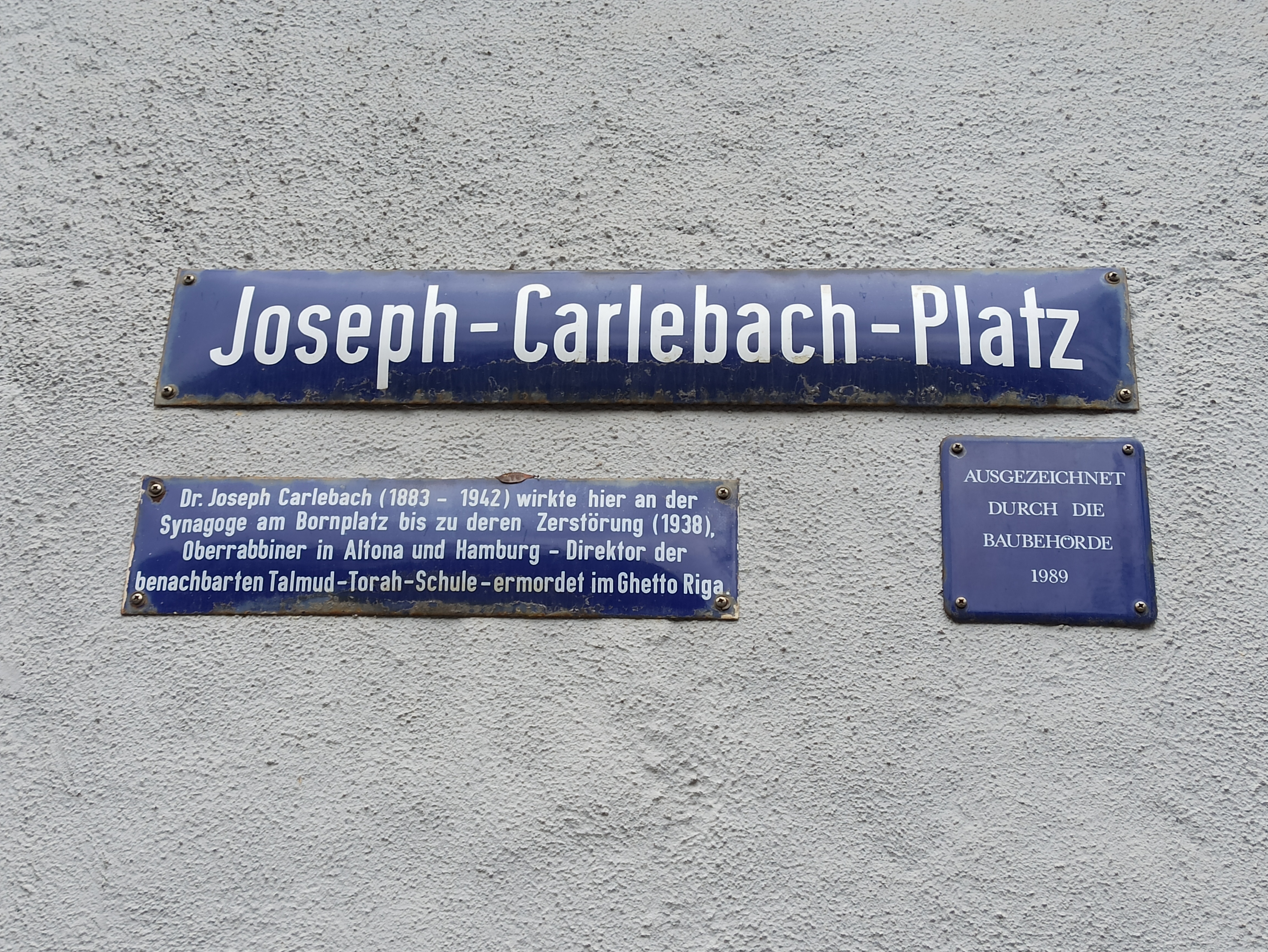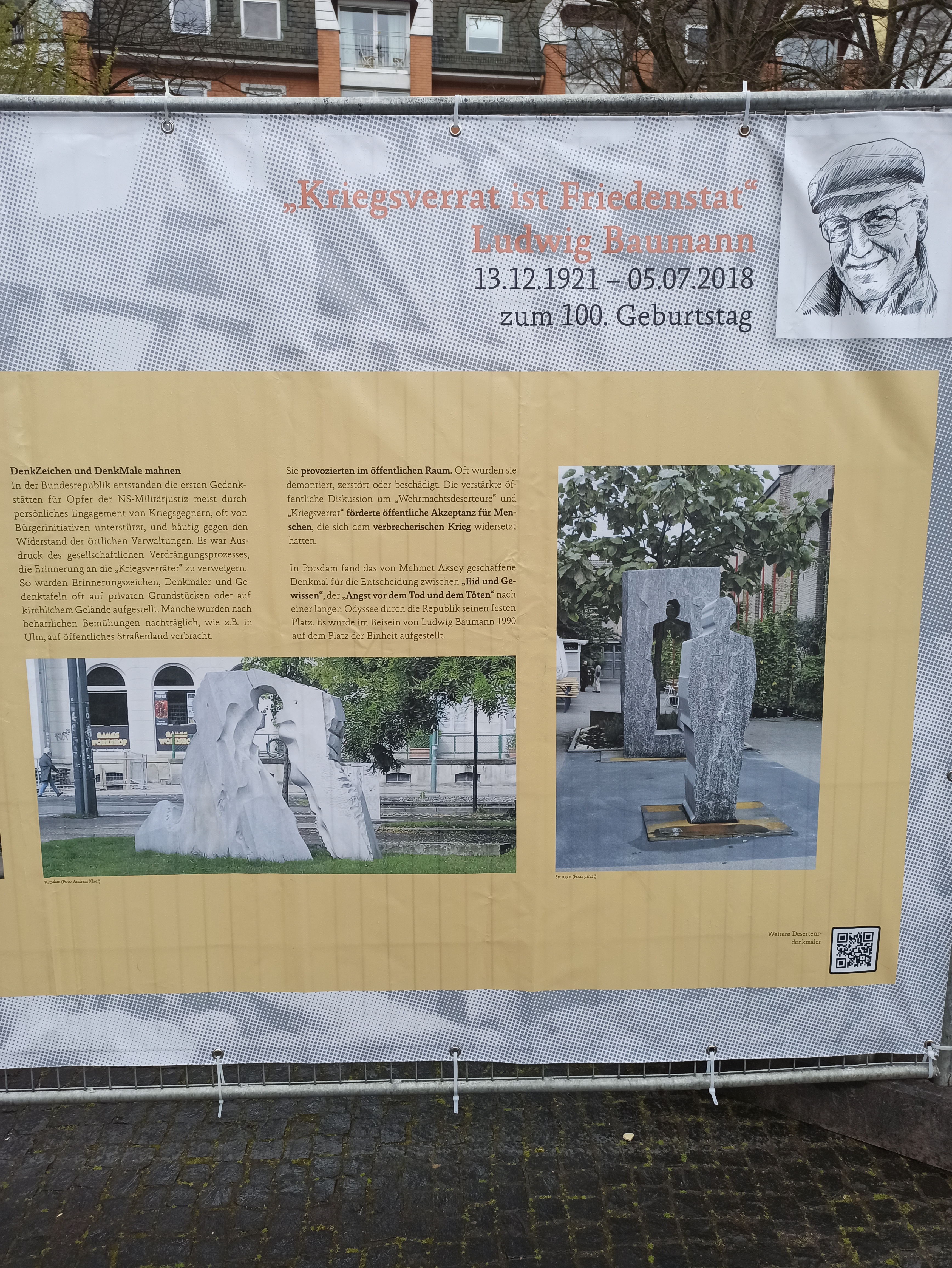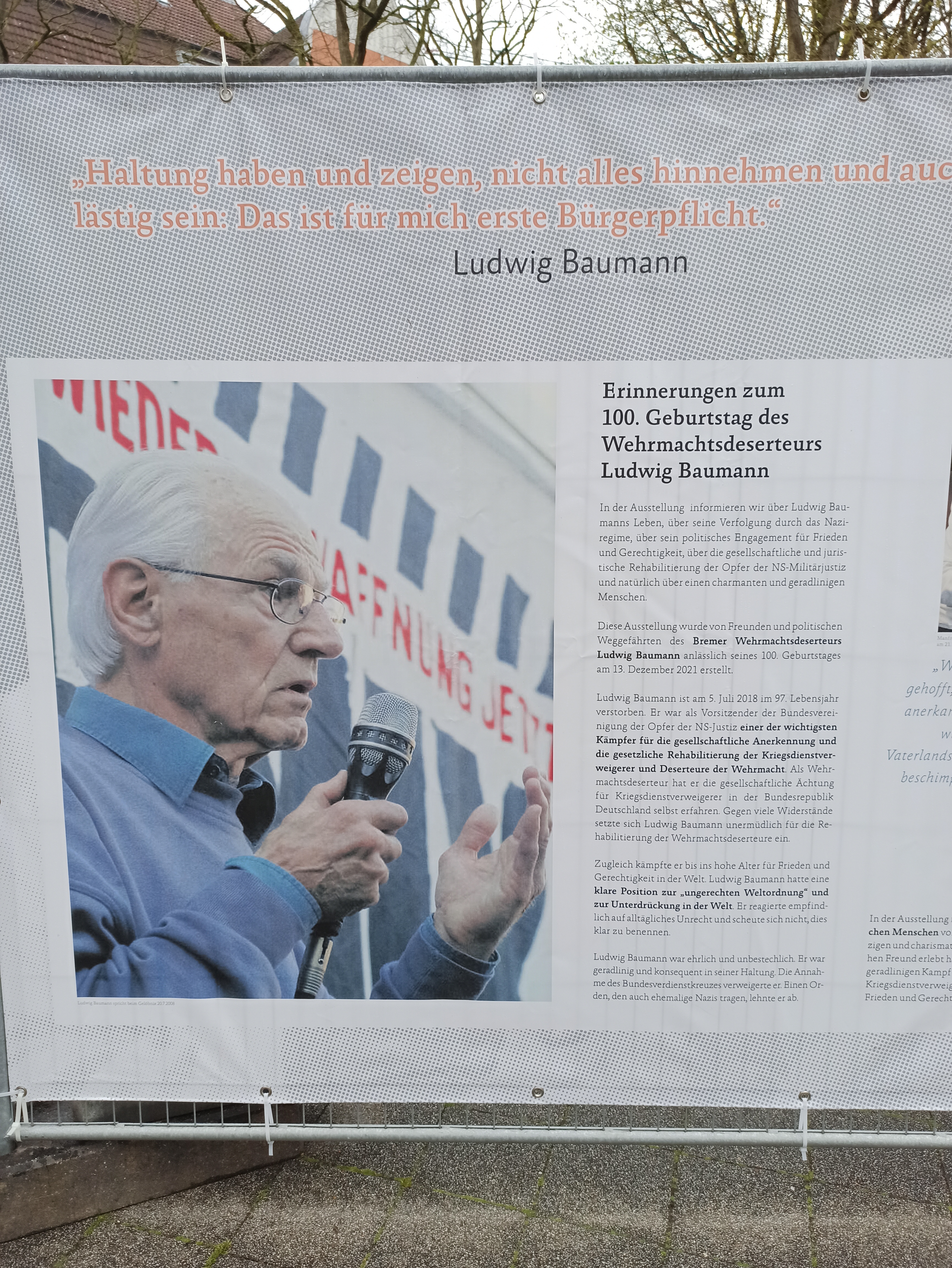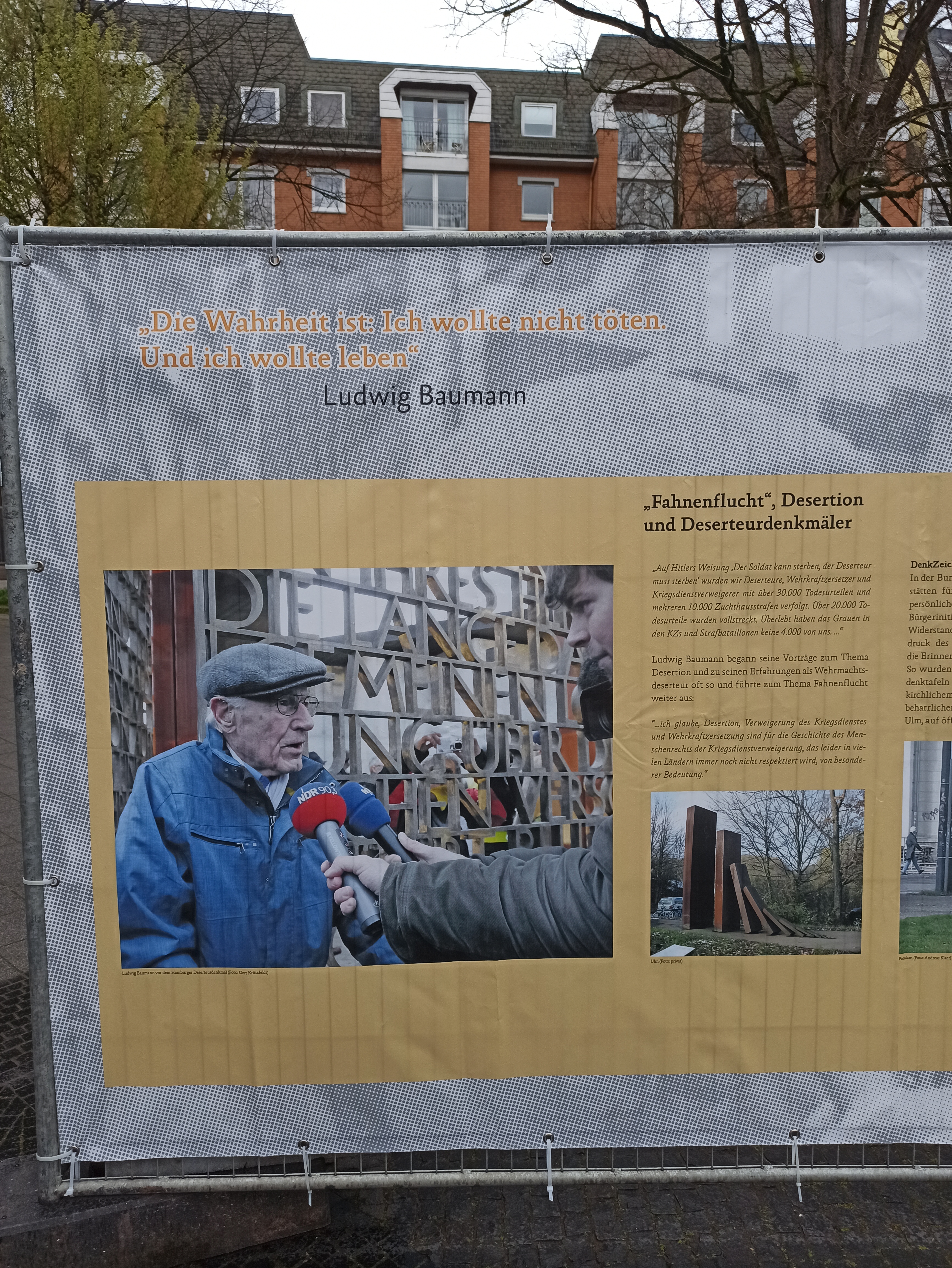 19 апреля в Гамбурге на площади Йосеф Карлебах Платц открылась уличная выставка, посвященная дезертиру Вермахта Людвигу Бауману. Место выбрано неспроста, оно имеет большую символическую ценность в городе. На этой площади рядом с университетским кампусом до 1938 года действовала Синагога на Борнплатц, которую снесли во времена национал-социализма. Площадь названа в честь главного раввина Гамбурга и Альтоны Др. Йосефа Карлебаха (1983–1942), убитого в рижском гетто. Сегодня на площади находится скульптура «Памятник синагоге» (1988) немецкой художницы Маргит Каль (1942–). Скульптура, сделанная в традициях концептуального искусства, представляет из себя мозаику, выложенную черным камнем на земле.