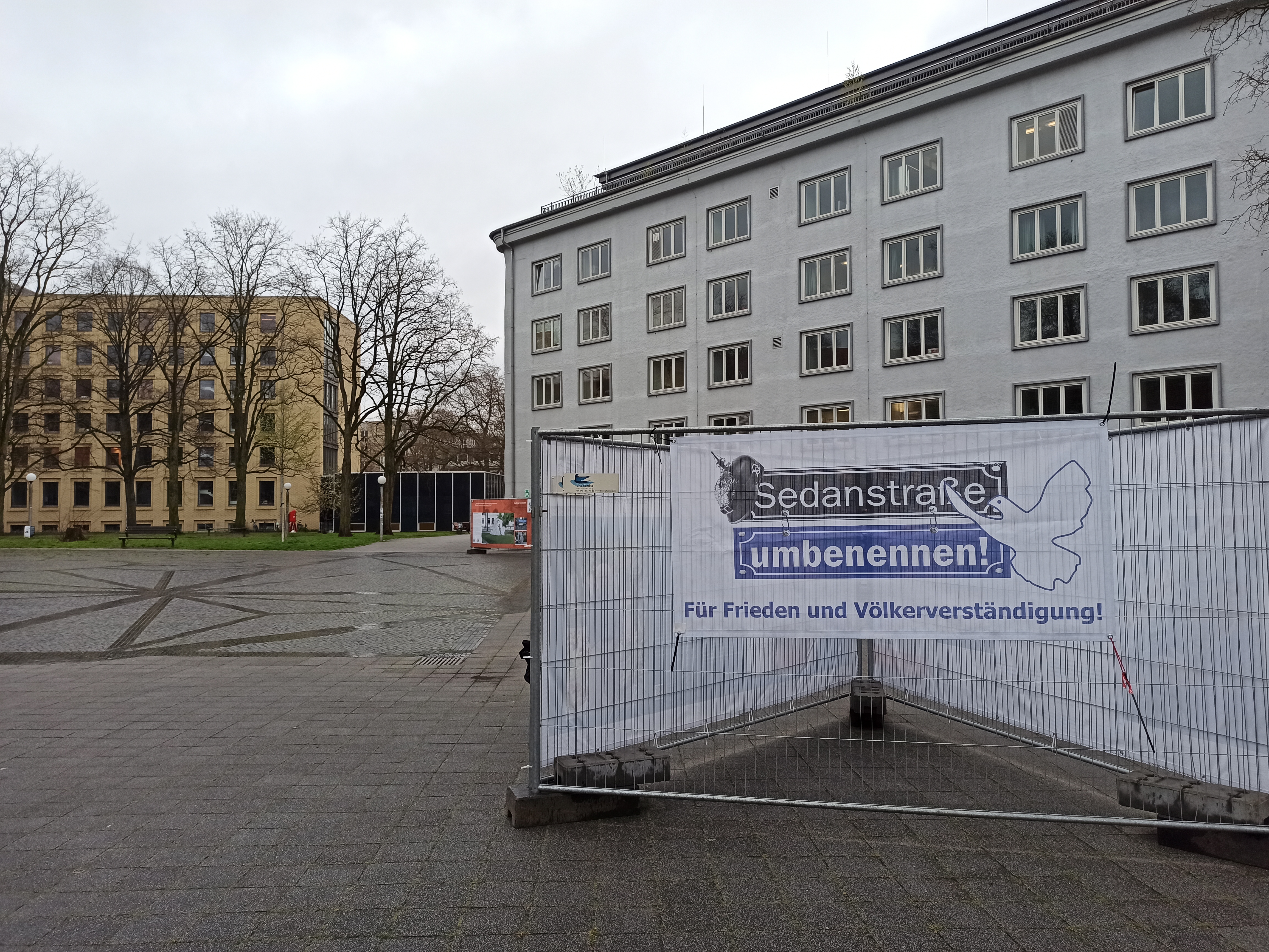 Устроители выставки в Гамбурге – инициатива «Переименовать улицу Седан!» («Sedanstraße unbenennen!«) при поддержке «Бранденбургской земельной организации для политического образования» (Brandenburgische Landeszentrale für politische Bildung) и НПО «Объединение для поддержки антивоенных традиций в городе Потсдам» (Verein zur Förderung Antimilitaristischer Traditionen in der Stadt Potsdam e.V.). Инициатива «Переименовать улицу Седан!» выступает за смену названия улицы, которая названа в честь разгрома французской армии под городом Седаном в 1870 году и таким образом до сего дня прославляет прусский милитаризм, сыгравший большую роль в приходе к власти национал-социалистов. Гамбургская улица Седан примыкает к университетским зданиям, где находятся MIN-факультеты: Математика, Информатика, Науки о природе (химия, физика, биология и пр.). Гамбургский MIN-факультет придерживается самообязывающего принципа мирного университета – Цивильклаузель (Zivilklausel). Это означает, что исследования на этих факультетах Университета Гамбурга ведутся исключительно для гражданских целей.