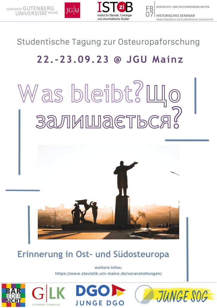 Am 23. September 2023 werde ich einen Kurzvortrag mit dem Titel «KünstlerInnen nach dem Gulag. Die Transformation der Erfahrung stalinistischer Repression in der bildenden Kunst» auf der studentischen Tagung «Was bleibt? Erinnerung in Ost- und Südosteuropa» an der Johannes Gutenberg-Universität Mainz halten. Hier finden Sie das vollständige Programm der Tagung.