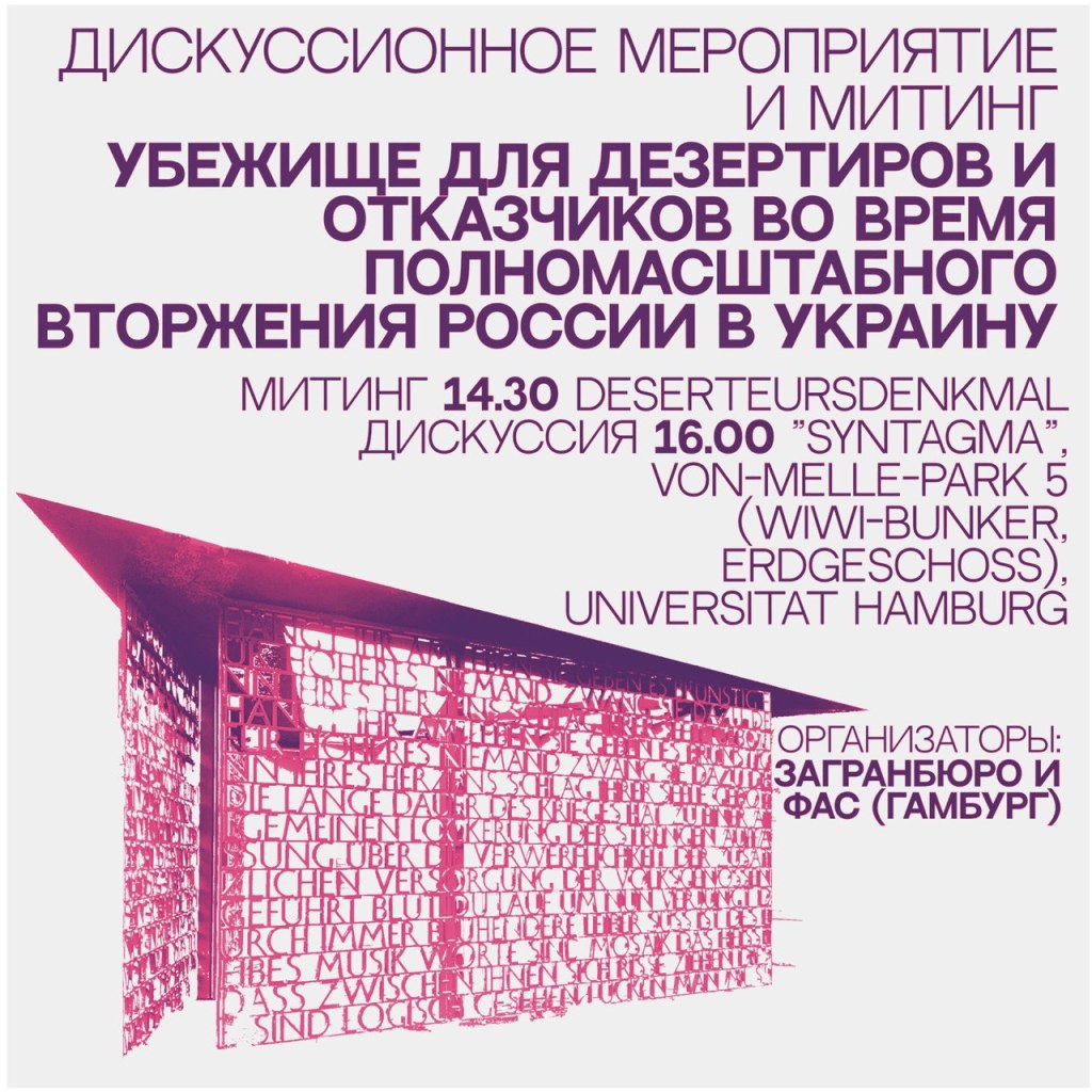 10 декабря — в день прав человека мы призываем немецкое правительство предоставлять убежище и защиту дезертирам и отказчикам от военной службы. В этот день мы зовем прийти на митинг у Памятника дезертирам на Даммторе в 14.30, чтобы постоять с плакатами и баннерами, а чуть позже в 16.00 присоединиться к дискуссии в одной из семинарных классов на кампусе Университета Гамбурга.