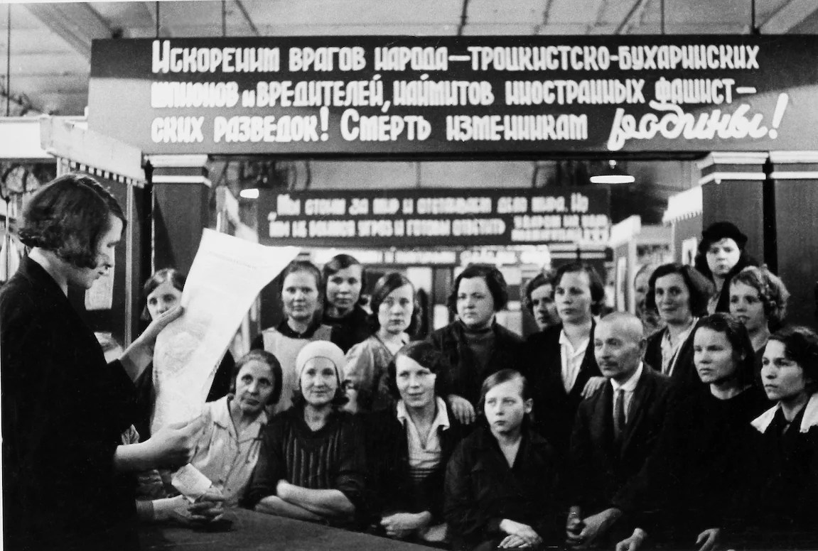 Das Transparent „Vernichten wir die Feinde des Volkes — trotzkistisch-bucharinische Spione und Saboteure, angeheuert von ausländischen faschistischen Geheimdiensten! Tod den Verrätern des Vaterlandes!“ (Искореним врагов народа — троцкистско-бухаринских шпионов и вредителей, наймитов иностранных фашистских разведок! Смерть изменникам родины!)