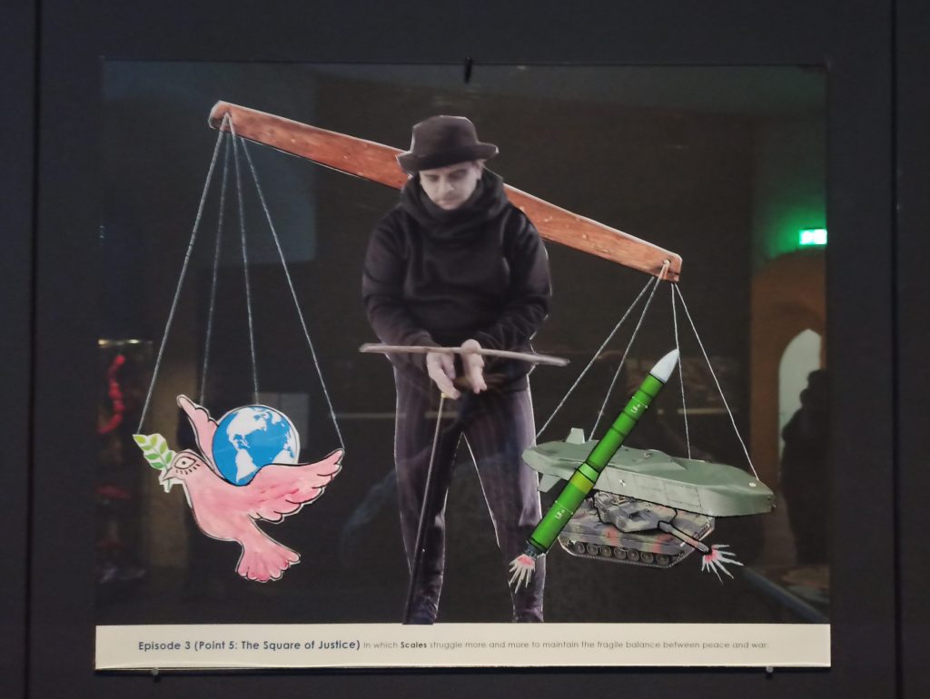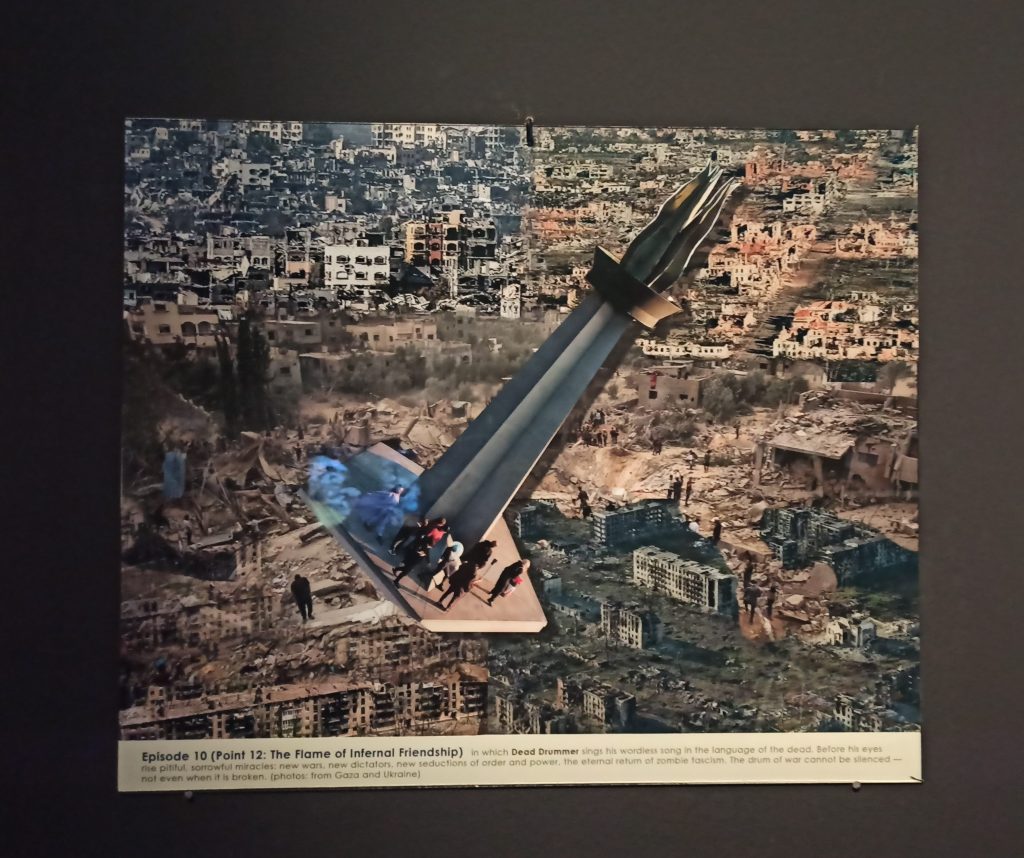 В музейной инсталяции фильм дополняют специально изготовленные к фильму коллажи. В целом они были задуманы, чтобы дать более полную информацию о героях фильма. Тем не менее на выставке они скорее выступают как отдельные произведения с их собственной агентностью. От фильма их отличает более политизированная репрезентация героев. Так коллаж «Музы, покидающие Германию» – реальной сценой на картине Тюбке, пририсованы палестинские флаги и баннеры, связывая эту сцену с дискуссиями вокруг мировой «отмены» Германии из-за репрессий против пропалестинских активистов*ок. В эпизоде 10, с мертвым барабанщиком, сколлажированы вместе руины городов Бахмут и Газа, ставя во главу не эксклюзивную солидарность с одной из сторон, но прежде всего страдания гражданского населения и последствия тотальной войны для руинированного городского ландшафта. В эпизоде 3 с Весами Правосудия взвешиваются голубь мира на одной чаше весов и продукты немецкого ВПК: танк «Леопард-2» и крылатая ракета «Таурус» на другой, отсылая к спорам о поставках немецкого оружия в Украину и войны до победного конца.