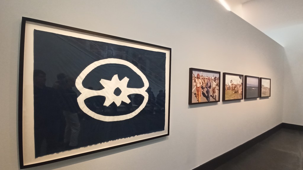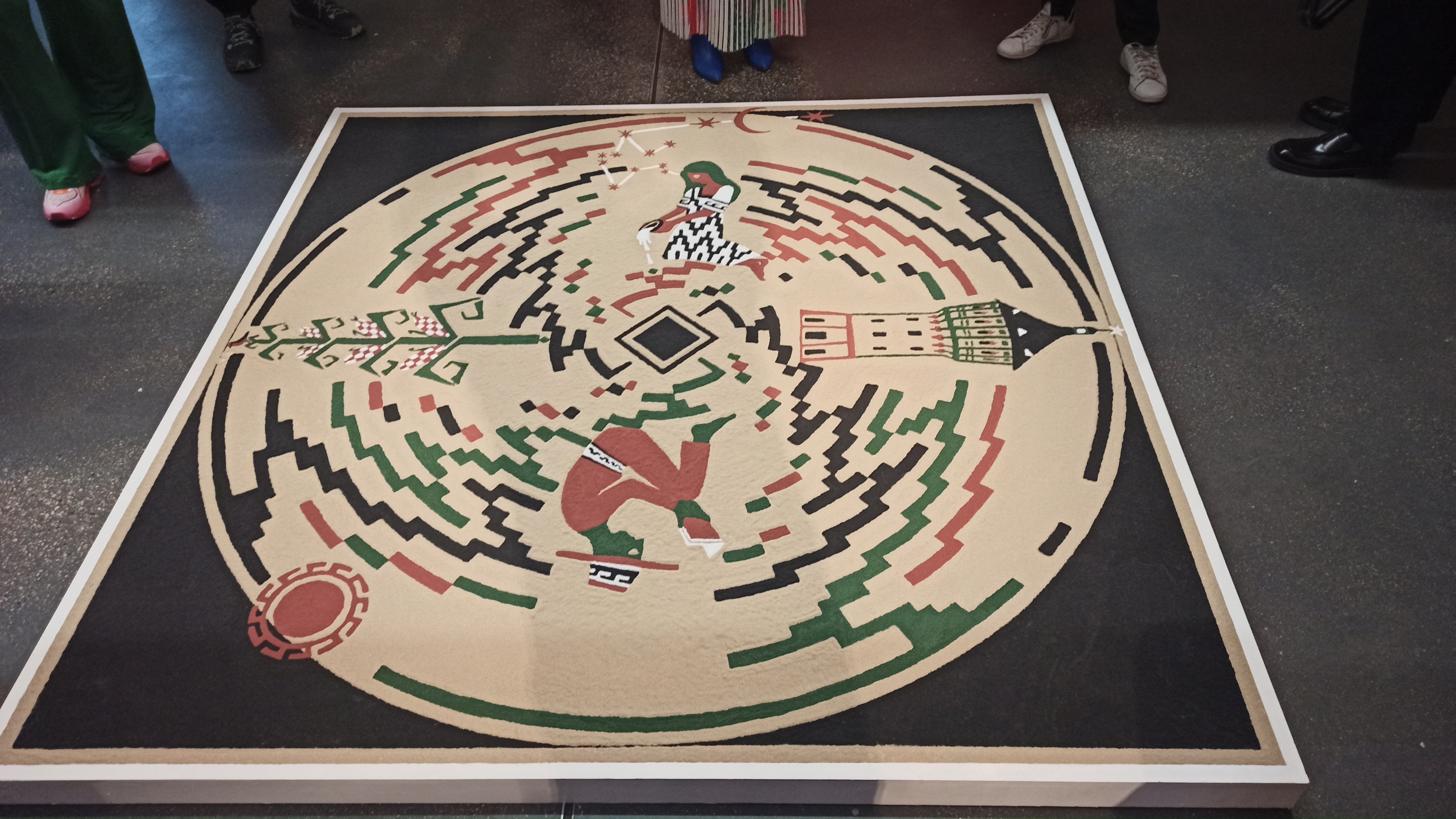 Схожую стратегию гибридности использует художник из Мексики Эдгардо Наварро, который представил работу «Планетарная мандала». В ней он объединяет традиционные орнаменты коренных народов с латиноамериканской теорией освобождения. На его самой большой мандале, лежащей на полу музея, среди солярных знаков и символов маиса можно разглядеть фигурку читающего книгу крестьянина. Изображение читающего человека или символа книги относится к иконографии эмансипации, которая активно использовалась на постсоветском пространстве во время русской революции и позже уже в советское время.