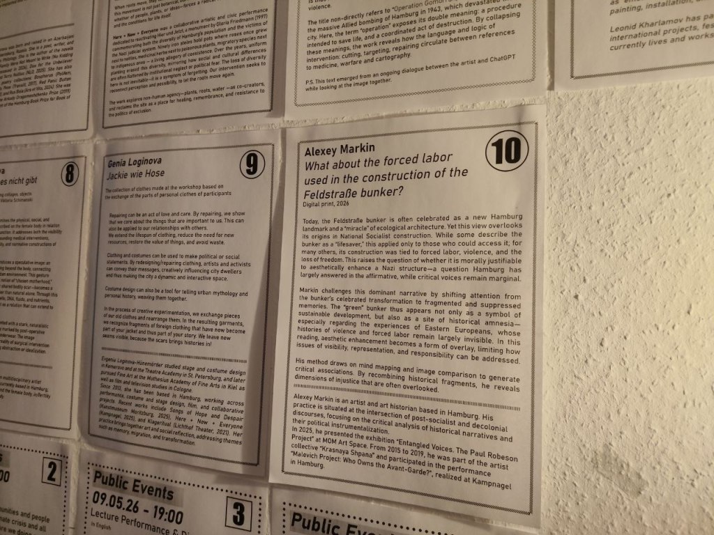 Am Freitag, den 24.04., um 19 Uhr wird die Ausstellung „Stitched Connections“ eröffnet, in der ich meine Arbeit mit dem Titel „Was ist eigentlich mit der Zwangsarbeit beim Bau des Feldstraßenbunkers?“ zeige.
